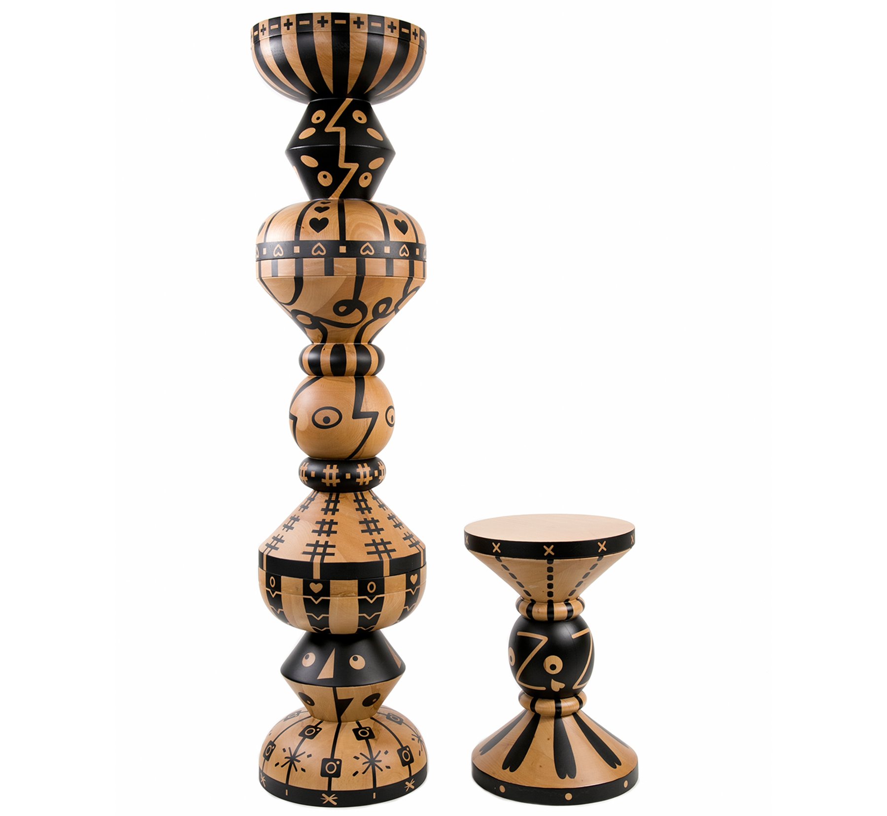The study of totems in various native culture led me to create contemporary totems in the form of stools, which combine industrial etching with the manual drawing of graphic elements. The illustrations appearing on the stools offer my interpretation of the experience of solitude and estrangement in modern society. Each stool functions as an independent totem; when they are piled one atop another, they produce a single totem that forms a rich visual continuum. When the order of the piled-up stools is changed, so is the narrative appearing on the totem – thus raising questions about the way we tell stories.